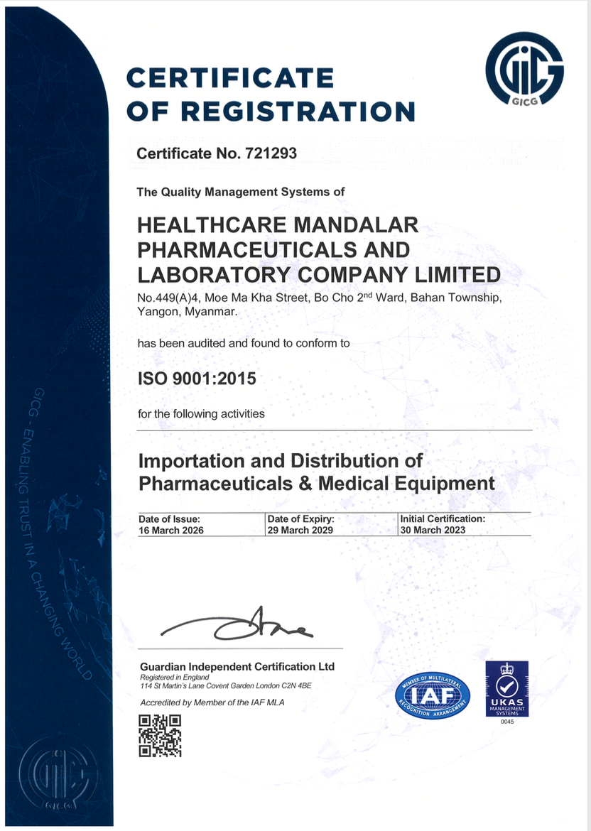 Healthcare Mandalar Pharmaceuticals and Laboratory Company is ISO 9001:2015 certified company offering a one stop comprehensive package of services that provides entire value chain for any prospective and existing partners from sourcing to after sale services for healthcare products inclusive of cold chain Healthcare Mandalar provides our partners with expertise , on the ground logistics and tailor made services based on a comprehensive network and including the following services.